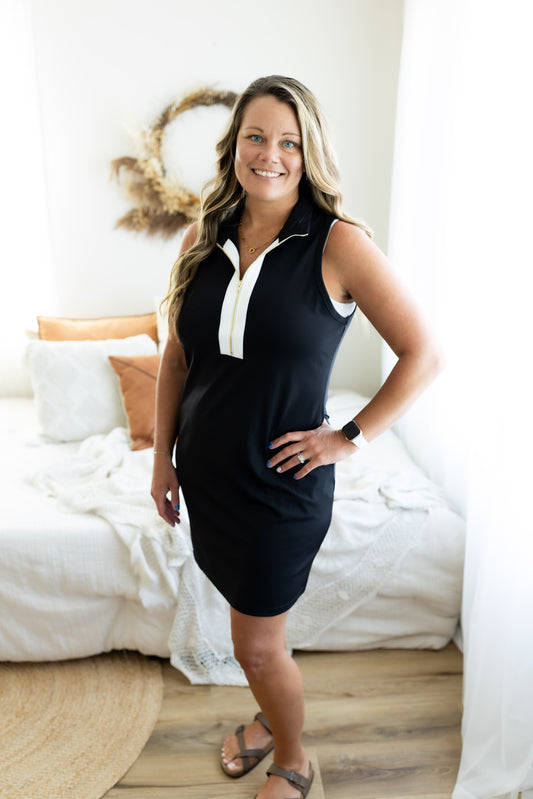 Everyday Black Zipper Dress with White Trim – Soft & Super Stretchy Comfort Dress