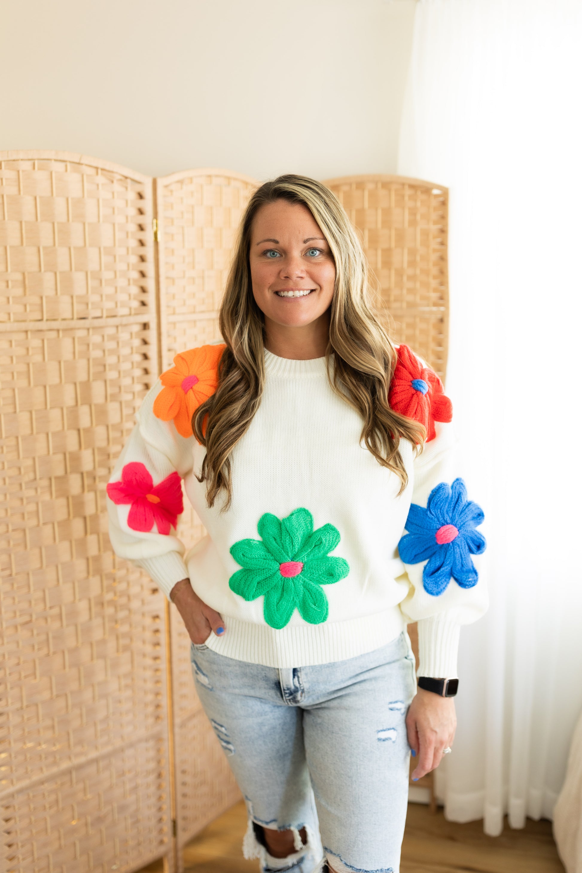 Multicolor Knit Floral Patchwork Sweater with Neon Embroidered Flowers