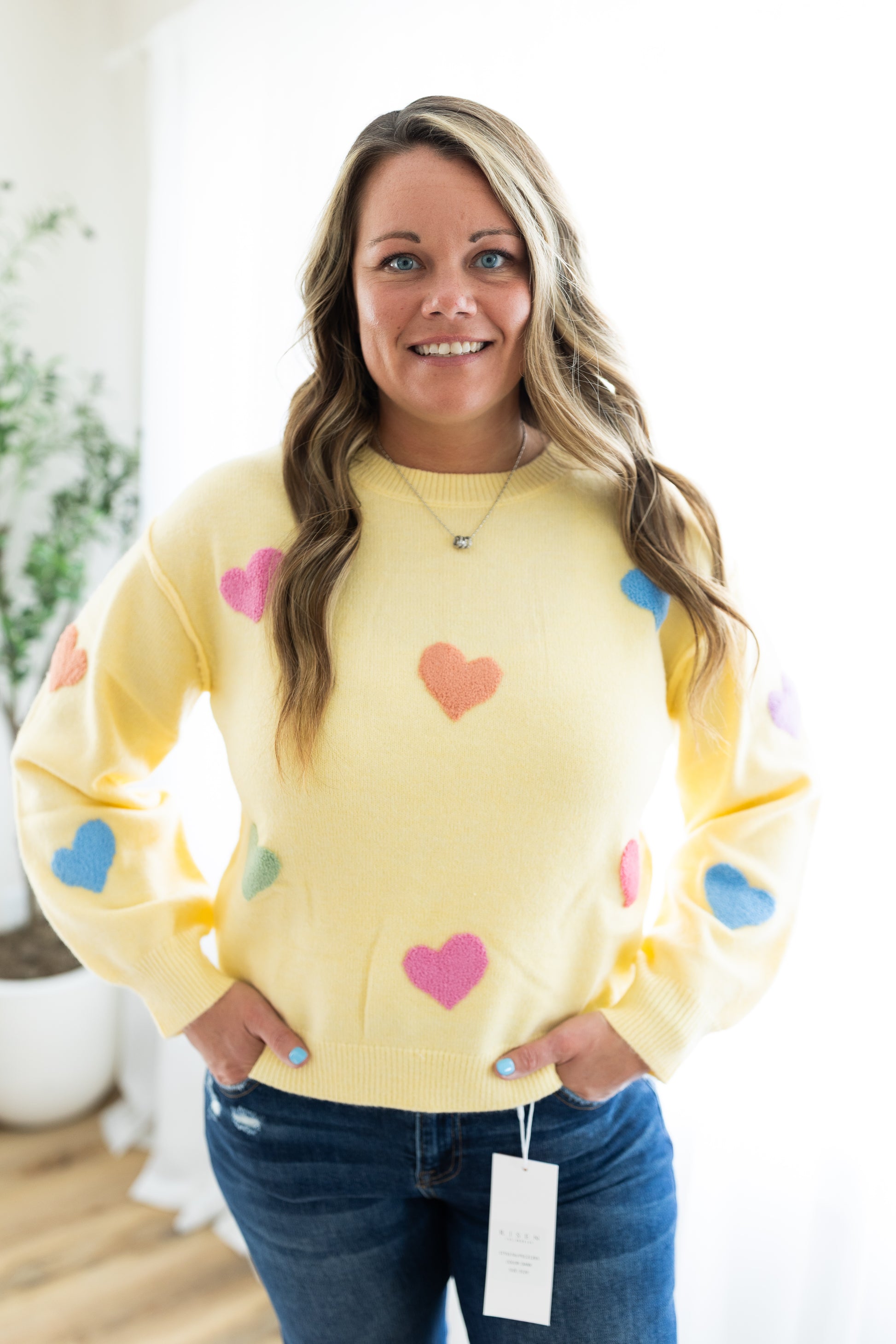 Add a pop of happy color to your wardrobe with this yellow sweater featuring knit multicolor hearts throughout. Soft, cozy, and full of charm, this playful sweater is perfect for brightening up casual outfits while staying comfy and stylish.